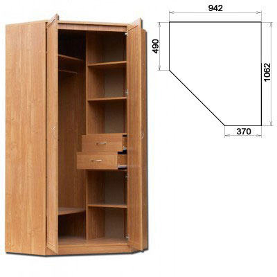 Несимметричный угловой шкаф со штангой, полками и двумя ящиками. Размер: 2216x 942 x 1062 мм В x Ш x Г Цвет: венге, дуб, ольха, берёза, груша.