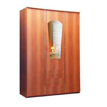 Фасадные поверхности ЛДСП с молдингом. Шкаф 3-х ств. с 3-я ящиками и зеркалом. 1490х560х2220 Цвет: вишня, орех.