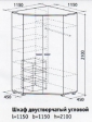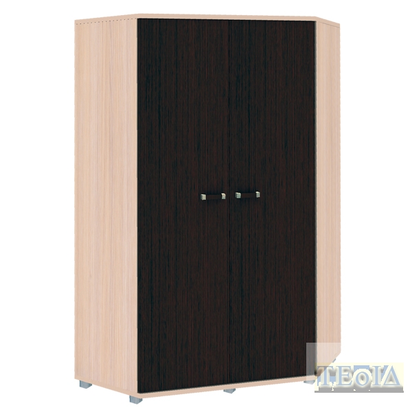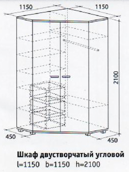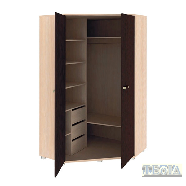 Размер, ДхГхВ, мм: 1150х1150х2100 Практичный, вместительный угловой двустворчатый шкаф «Карамель». Корпус цвет млечный дуб, а двери цвет венге.