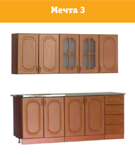 Комплектация кухоного гарнитура «МЕЧТА-3» (1,6м): • Шкаф навесной 1-дверный с полкой 400300720 • Шкаф навесной 2-дверный со стеклом и полкой 600300720 • Шкаф навесной 2-дверный (сушка) 600300720 • Стол рабочий с 4-мя ящиками 400600850 • Стол рабочий 2-дверный с полкой 600600850 • Стол-мойка 2-дверный 600600850 • За отдельную плату кухонный гарнитур комплектуется мойкой 600мм и сушителем 600мм. • Кол-во мест – 6 упаковок + стекло + фурнитура. • Вес – 113 кг.