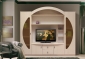 Полка под ТВ с стойкой для дисков. Внизу два выдвижных ящика. Два отдела с дверками без полок. Два раздела с полками за застеклёнными дверками. Большая полка над полкой для ТВ.
