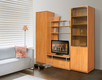 Ниша для ТВ. Полка для аппаратуры. Три декоративных полки для небольших предметов. Отдел со стеклянными дверками для посуды. Отдел для белья. Шкаф для одежды.