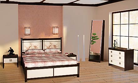 Новинка 2010 года – спальня «Киото» создана в японском стиле, основной принцип которого – гармония с природой. В спальне, оформленной в японском стиле, незримо присутствует дух искусных гейш и темпераментных самураев, что способствует поддержанию гармоничных отношений. Мебель для спальни «Киото» уникальна тем, что изображения, нанесенные на фасады, выполнены по мотивам пейзажей известного японского художника и философа Тэнсе Сюбун, жившего в XV веке. Сочетание корпуса цвета «линум венге» и кремовых фасадов из ЛДСП с ручками, покрытыми бронзой (бельгийского производства), прямые линии и сдержанный декор подчеркивают красоту и лаконичность японского стиля. Серия включает в себя все необходимые предметы интерьера: удобную кровать, вместительный шкаф-купе, тумбы, комод, туалетный стол с зеркалом и банкеткой, напольное зеркало, чтобы можно было видеть себя во весь рост и даже маленький столик для чайных церемоний!  Мы уверены, что в такой спальне вы по-настоящему сможете отвлечься от суеты внешнего мира!