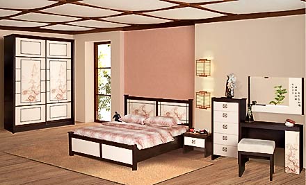 Новинка 2010 года – спальня «Киото» создана в японском стиле, основной принцип которого – гармония с природой. В спальне, оформленной в японском стиле, незримо присутствует дух искусных гейш и темпераментных самураев, что способствует поддержанию гармоничных отношений. Мебель для спальни «Киото» уникальна тем, что изображения, нанесенные на фасады, выполнены по мотивам пейзажей известного японского художника и философа Тэнсе Сюбун, жившего в XV веке. Сочетание корпуса цвета «линум венге» и кремовых фасадов из ЛДСП с ручками, покрытыми бронзой (бельгийского производства), прямые линии и сдержанный декор подчеркивают красоту и лаконичность японского стиля. Серия включает в себя все необходимые предметы интерьера: удобную кровать, вместительный шкаф-купе, тумбы, комод, туалетный стол с зеркалом и банкеткой, напольное зеркало, чтобы можно было видеть себя во весь рост и даже маленький столик для чайных церемоний! Мы уверены, что в такой спальне вы по-настоящему сможете отвлечься от суеты внешнего мира!