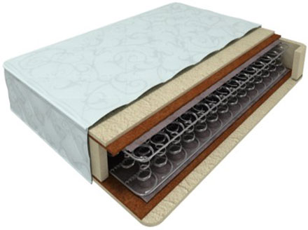 Состав: Чехол из синтетического жаккарда, стеганного на синтепоне Пенополиуретан Кокосовая койра Термовойлок Пружинный блок «Боннель» Пенополиуретан по периметру