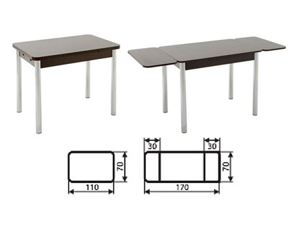 Столы этой серии имеет компактную форму, комплектуются вставками с двух сторон столешницы. Вставки хранятся в столе. Углы столешницы и вставок закруглены по бокам. Рекомендуется к приобретению для семей с маленькими детьми. Подстолье хромированное.